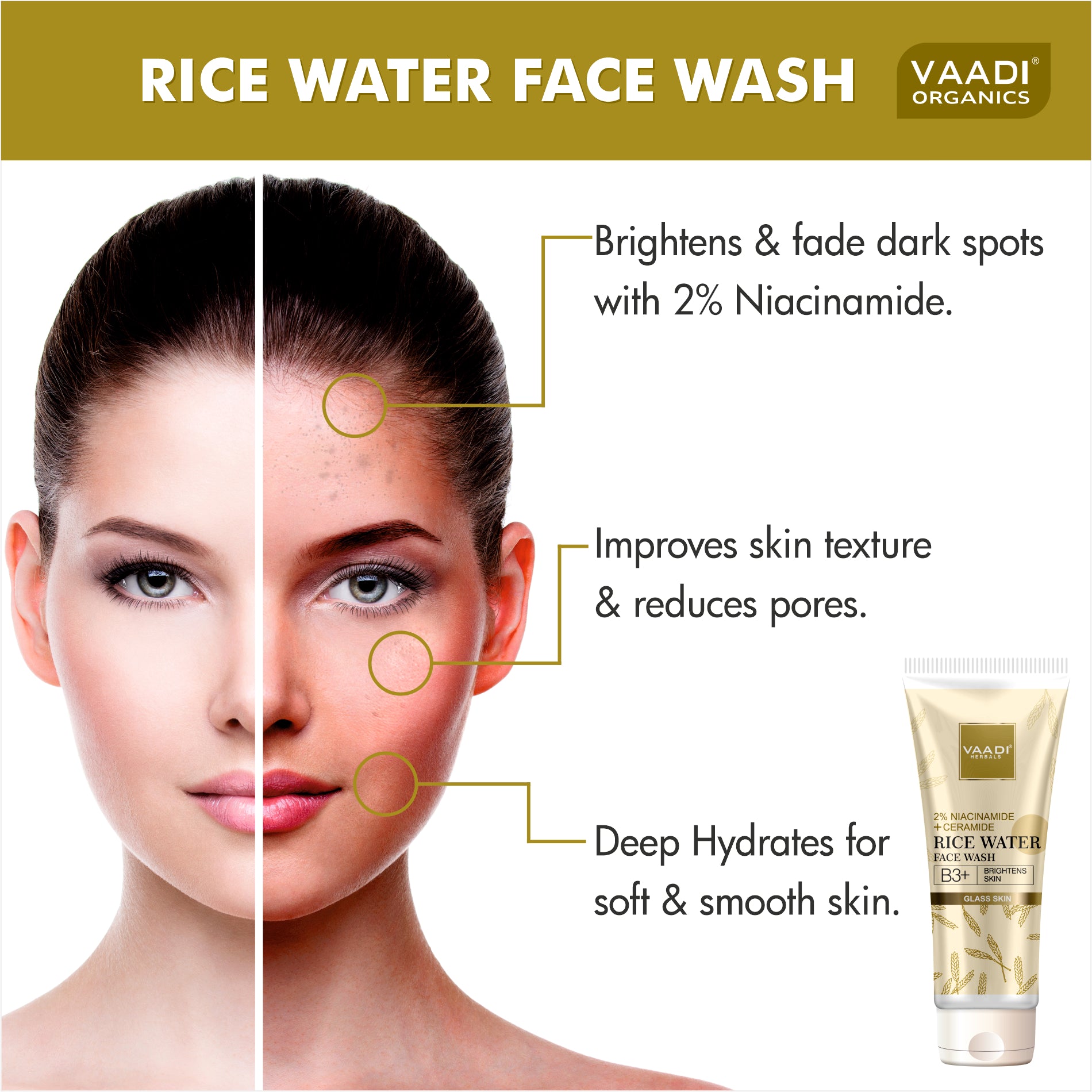 An advanced skin-brightening and texture-refining herbal formulation, this Rice Water Face Wash gently removes impurities while deeply nourishing the skin. Inspired by centuries-old Asian beauty rituals, fermented Rice Water is known to boost radiance, minimize pores and improve skin smoothness — giving the complexion a naturally illuminated glow. Powered with 2% Niacinamide (Vitamin B3+) and Ceramide, this face wash helps repair daily environmental damage, strengthens the skin barrier and restores moisture balance. The skin feels clean, soft and hydrated after every wash — without dryness or tightness. Regular use gradually transforms dull and uneven skin into a visibly brighter, clearer and “glass-skin” looking complexion.