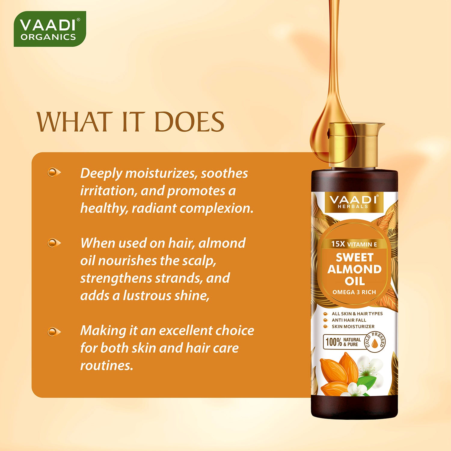 Almond oil, packed with vitamin E, fatty acids, and proteins, is a versatile natural beauty solution. For skin, it deeply moisturizes, soothes irritation, and promotes a healthy, radiant complexion. When used on hair, almond oil nourishes the scalp, strengthens strands, and adds a lustrous shine, making it an excellent choice for both skin and hair care routines.