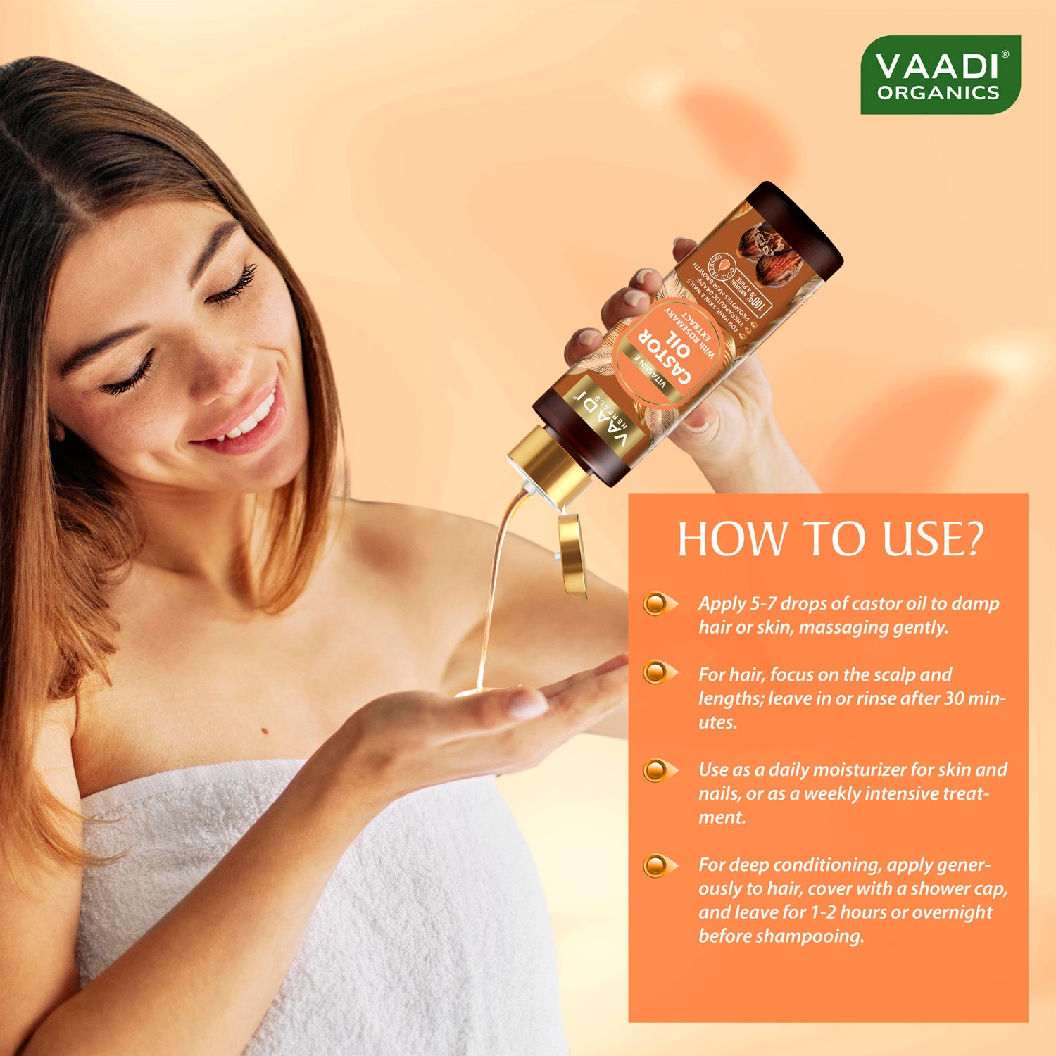Apply 5-7 drops of castor oil to damp hair or skin, massaging gently. For hair, focus on the scalp and lengths; leave in or rinse after 30 minutes. Use as a daily moisturizer for skin and nails, or as a weekly intensive treatment. For deep conditioning, apply generously to hair, cover with a shower cap, and leave for 1-2 hours or overnight before shampooing.
