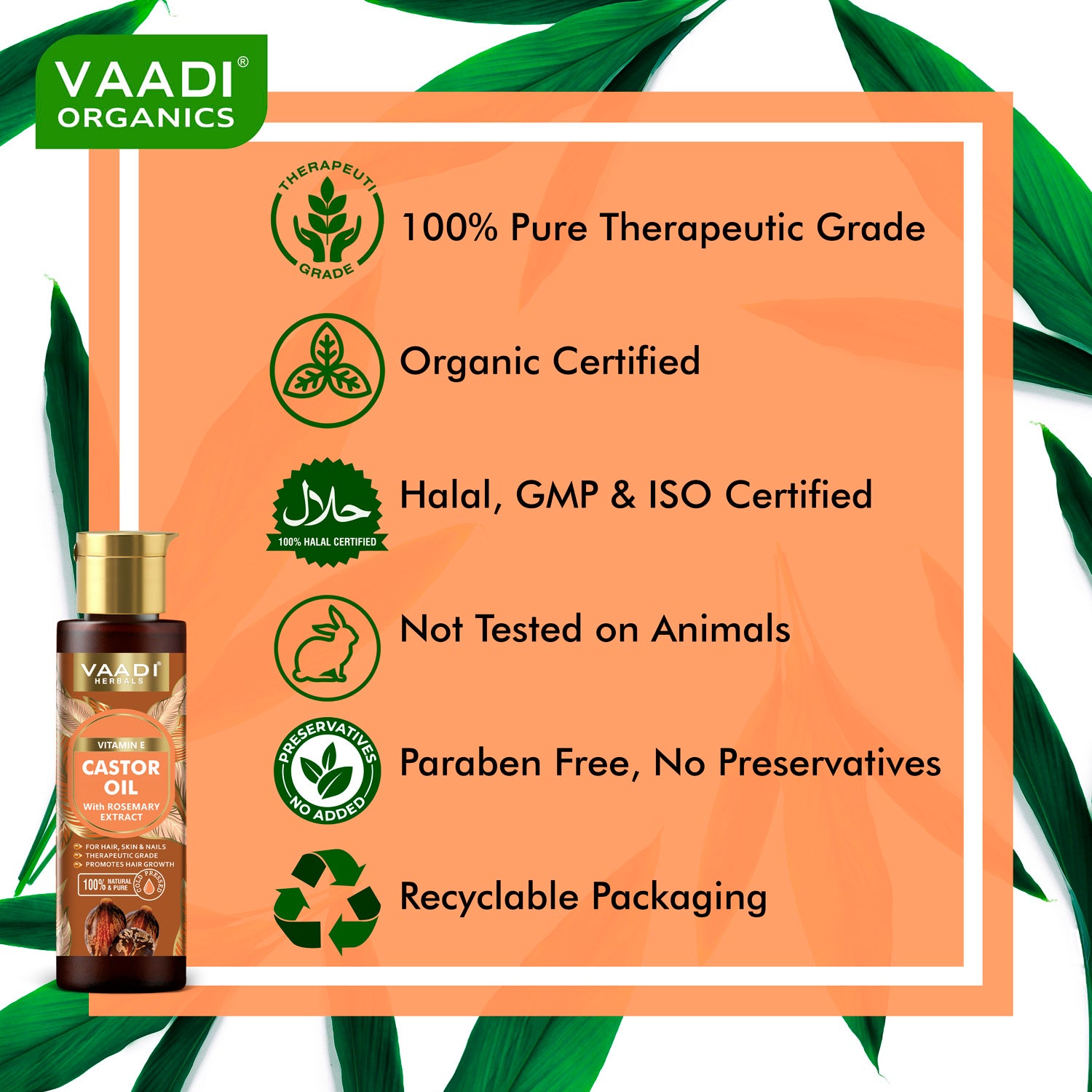 Ingredients : "100% Pure & Natural Organic Castor Oil (Ricinus Communis), Marula Oil, (Sclerocarya Birrea Seed 01), Vitamin E (tocopherol), Rosemary Extract (Rosmarinus Officinalis Leaf Extract), Vitamin B3 (Niacinamide) "