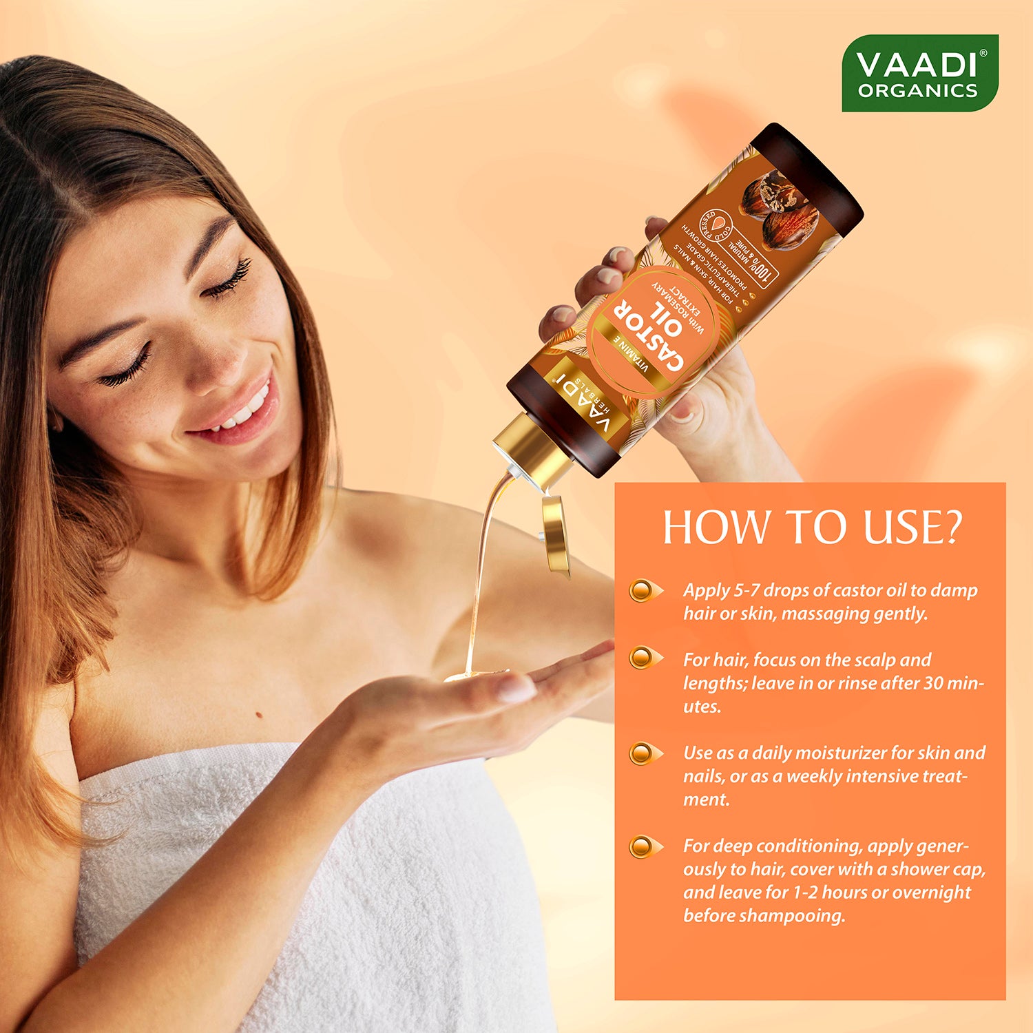 Apply 5-7 drops of castor oil to damp hair or skin, massaging gently. For hair, focus on the scalp and lengths; leave in or rinse after 30 minutes. Use as a daily moisturizer for skin and nails, or as a weekly intensive treatment. For deep conditioning, apply generously to hair, cover with a shower cap, and leave for 1-2 hours or overnight before shampooing.