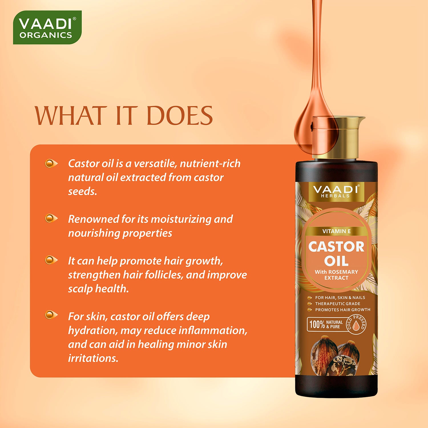 Castor oil is a versatile, nutrient-rich natural oil extracted from castor seeds. Renowned for its moisturizing and nourishing properties, it can help promote hair growth, strengthen hair follicles, and improve scalp health. For skin, castor oil offers deep hydration, may reduce inflammation, and can aid in healing minor skin irritations.