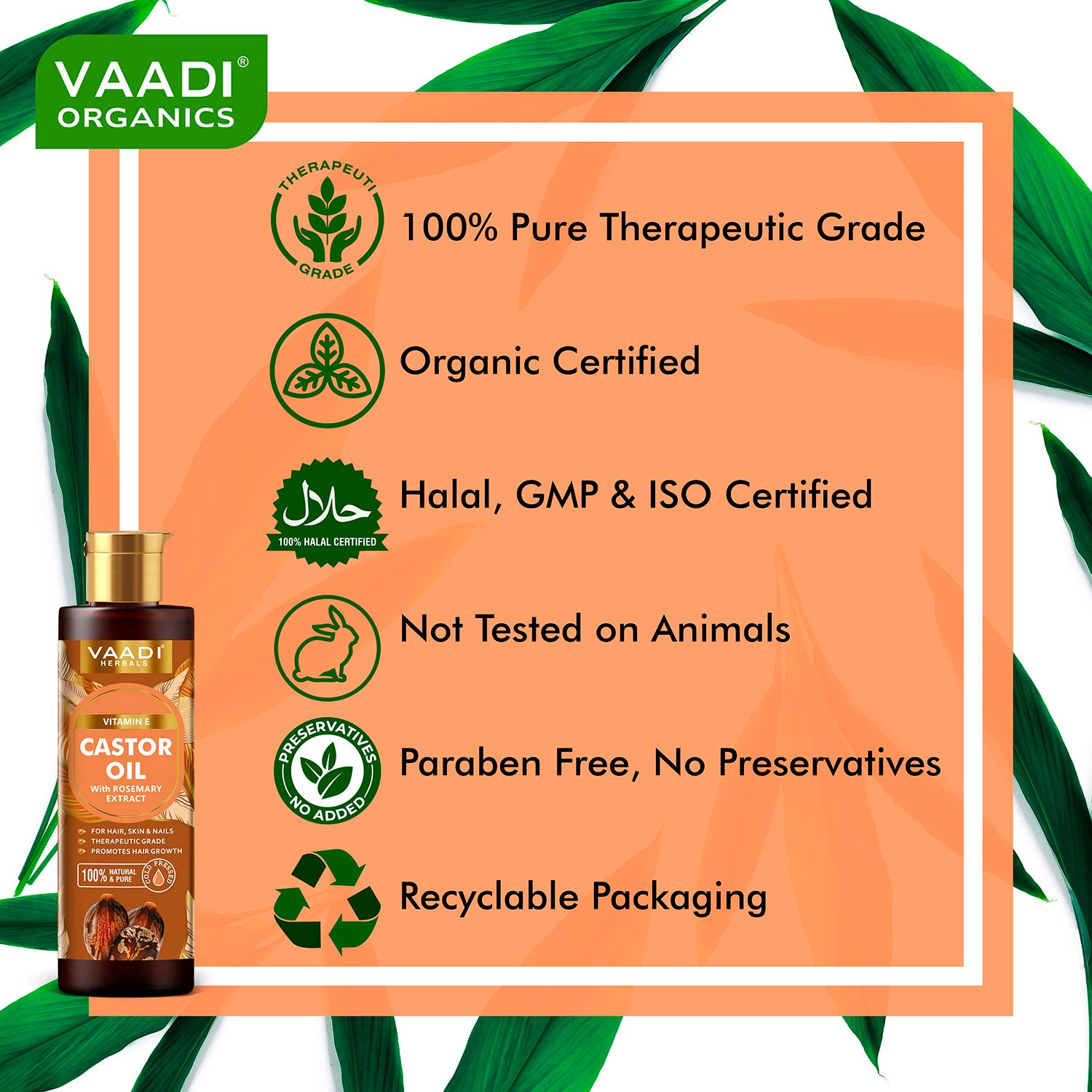 Ingredients : "100% Pure & Natural Organic Castor Oil (Ricinus Communis), Marula Oil, (Sclerocarya Birrea Seed 01), Vitamin E (tocopherol), Rosemary Extract (Rosmarinus Officinalis Leaf Extract), Vitamin B3 (Niacinamide) "